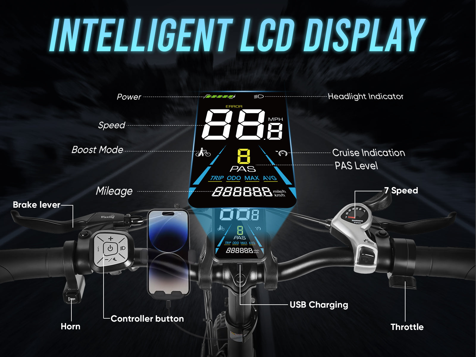 The 4-inch central LCD color intelligent meter displays battery life, speed, and mileage, so you can always know the status of your e-bike.